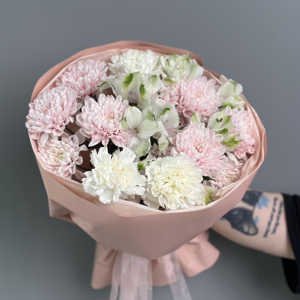 В букете представлены нежная хризантема в розовом цвете, которая идеально дополняется нежными альстромериями в белом цвете 😍 Каждый цветок был осмотрен и отобран с большой тщательностью, чтобы гарантировать максимальное качество и долговечность🥰